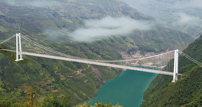 The main bridge of Jinshajiang Bridge for Huaping-Lijiang Expressway inYunnan Province is a single-span plate-truss and steel-truss stiffened girdersuspension bridge with the main span of 1386m. It is the largest suspensionbridge in mountainous area in the world at present.